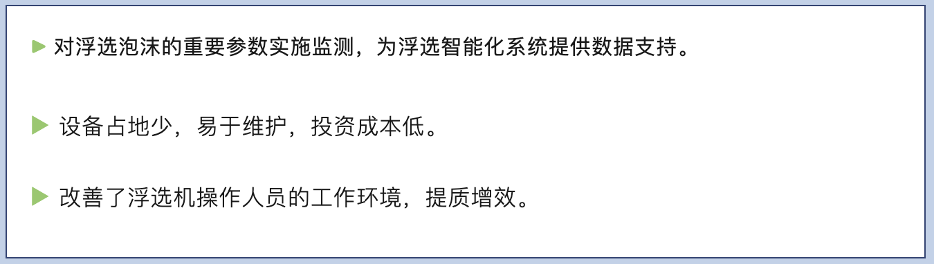 美騰的礦物浮選智能化系統(tǒng),是通過精準(zhǔn)的傳感器技術(shù),在線檢測泡沫層厚度、充氣量、礦漿品位、泡沫性質(zhì)等關(guān)鍵實時生產(chǎn)數(shù)據(jù),以此作為基礎(chǔ)數(shù)據(jù),基于工業(yè)物聯(lián)平臺,引入神經(jīng)網(wǎng)絡(luò)、預(yù)測控制、模糊控制等先進(jìn)算法,實現(xiàn)浮選過程實時監(jiān)控,浮選操作智能調(diào)節(jié),從而達(dá)到減少人工干預(yù),降低生產(chǎn)成本,穩(wěn)定精礦品位,提高回收率的目的。